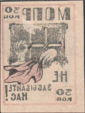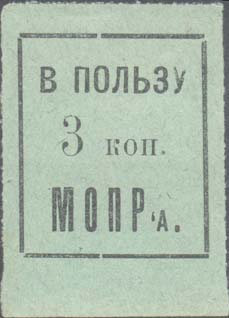 1930(?) г. Разм. 48 х 64 мм. Двухцветная печать плотной белой бумаге. В прямоугольной рамке в центре эмблема МОПР. В правом верхнем и в левом нижнем углах в прямоугольных рамках номинал. Сверху аббревиатура: «МОПР». Внизу текст в три строки: «Не забывайте нас!».
