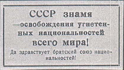 1928(?) г. Разм. 76 х 42 мм. Одноцветная печать на светло-серой бумаге. В прямоугольной рамке разм. 72 х 38 мм текст в шесть строк: «СССР знамя – освобождения угнетенных национальностей всего мира! Да здравствует братский союз национальностей!».