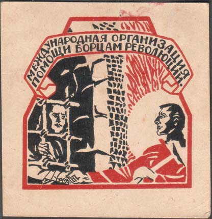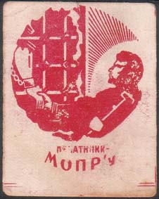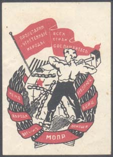 1930(?) г. Разм. 45 х 62 мм. Двухцветная печать на бумаге различных цветов. В центре аллегорический рисунок: Рабочий сбивающий цепи с земного шара в обрамлении венка из лавровых листьев, перевитых лентой. На ленте текст: «Международн[ая]. Организ[ация]. МОПР помощи борц[ам]. Революц[ии]». Сверху на знамени текст в три строки: «Пролетарии и угнетенные народы всех стран соединяйтесь».