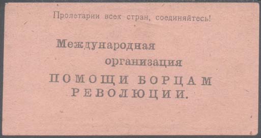 1930(?) г. Разм. 85 х 34 мм. Одноцветная печать на светло-розовой бумаге. Сверху текст: «Пролетарии всех стран, соединяйтесь!». Внизу текст в четыре строки: «Международная организация помощи борцам революции».