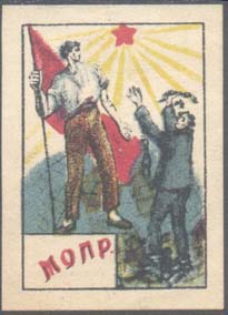 1930(?) г. Разм. 34 х 46 мм. Многоцветная печать на белой бумаге. В прямоугольной рамке разм. 28 х 40 мм на фоне земного шара рабочий с красным знаменем и заключенный, разрывающий кандалы. Сверху пятиконечная звезда с лучами. В левом нижнем углу в прямоугольной рамке аббревиатура «МОПР».