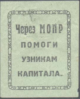 1926(?) г. Разм. 68 х 57 мм. Двухцветная печать на тонкой светло-зеленой бумаге. В центре в прямоугольной рамке разм. 36 х 32 эмблема МОПР. Снаружи по периметру текст: «М.О.П.Р. Помогите!!! Заключенным в тюрьмах капитала».