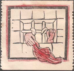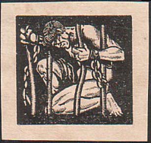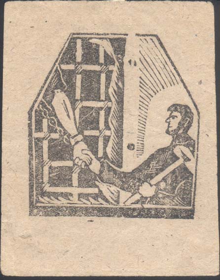 1930(?) г. Разм. 50 х 48 мм. Одноцветная печать на плотной белой бумаге. В центре аллегорический рисунок: заключенный, разгибающий прутья тюремной решетки.
