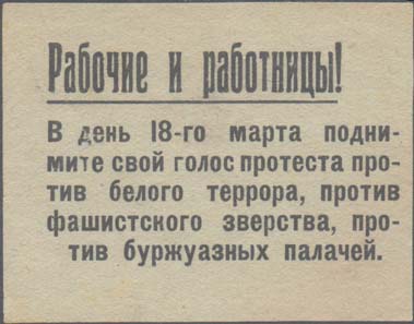 1930(?) г. 18 марта. Разм. 63 х 49 мм. Одноцветная печать на зелено-серой бумаге. Сверху текст с подчеркиванием: «Рабочие и работницы!». Ниже продолжение текста в пять строк: «В день 18-го марта поднимайте свой голос протеста против белого террора, против фашистского зверства, против буржуазных палачей».