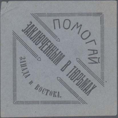 1930(?) г. Ромб разм. 97 х 97 мм. Одноцветная печать на тонкой бумаге различных цветов. В центре текст: «Заключенным в тюрьмах. Сверху в тройной треугольной рамке разм. 62 х 30 мм текст: «Помогай». Внизу в такой же рамке продолжение текста: «Запада и Востока».