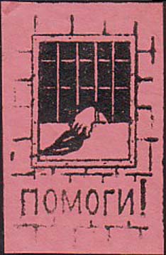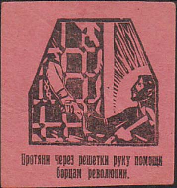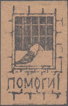 1930(?) г. Разм. 55 х 71 мм. Одноцветная печать на серо-зеленой бумаге. В прямоугольной рамке разм. 38 х 51 мм с рука с платком, просунутая сквозь тюремную решетку из углового окна. На заднем плане индустриальный пейзаж. Сверху аббревиатура «МОПР».
