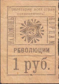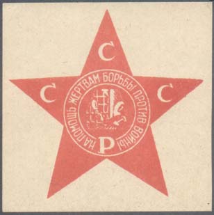 1930(?) г. Разм. 40 х 55 мм. Одноцветная печать на плотной желтоватой бумаге. В двойной прямоугольной рамке разм. 32 х 45 мм в центре пятиконечная звезда с серпом и молотом в центре. По периметру между рамками текст: «Пролетарии всех стран, соединяйтесь! На помощь борцам революции». Внизу в отдельной рамке номинал.