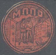 1930(?) г. Круг диаметром 30 мм. Двухцветная печать на тонкой желтоватой бумаге. В центре в двойной круглой рамке двое рабочих на фоне городских построек. Внизу восходящее солнце с лучами. Сверху аббревиатура «МОПР».