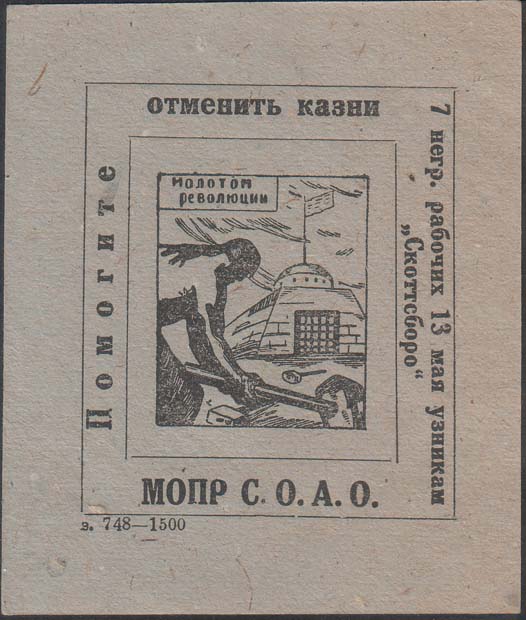 1931 г. Листок разм. 87 х 103 мм. Одноцветная печать на толстой серо-зеленой бумаге. В центре в тройной прямоугольной рамке разм. 63 х 73 мм аллегорический рисунок: Здание тюрьмы и рабочий с молотом. В левом верхнем углу текст в две строки: «Молотом революции». По пери-метру между наружными рамками текст: «Помогите отменить казни 7 негр[итянских]. Рабочих. 13 мая узникам «Скоттсборо» МОПР С.О.А.О.». Слева внизу под рамкой выходные данные мелким шрифтом: «З. 748-1500».