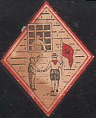 1930(?) г. Ромб разм. 33 х 40 мм. Двухцветная печать на плотной желтоватой бумаге. В рамке в форме ромба два пионера с красным знаменем перед тюремным окном с решеткой, и заключенный.