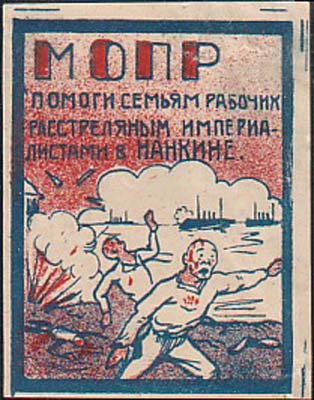 1930(?) г. Разм. рамки 47,5 х 62,57 мм. Двухцветная печать на белой бумаге. В толстой прямоугольной рамке военные корабли, расстреливающие рабочих на берегу. Сверху текст в четыре строки: «МОПР. Помоги семьям рабочих расстрелянным империалистами в Нанкине». По углам знака разграничительные линии.