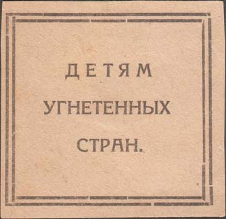 1930(?) г. Разм. 56 х 53 мм. Одноцветная печать на желто-серой бумаге. В двойной прямоугольной рамке разм. 50 х 46 мм в центре текст в три строки: «Детям угнетенных стран».
