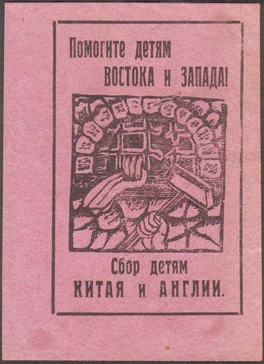 1930(?) г. Разм. 63 х 87 мм. Одноцветная печать на розово-красной бумаге. В прямоугольной рамке разм. 47 х 72 мм в центре стена с тюремной решеткой и рука с молотом. Сверху текст в две строки: «Помогите детям Востока и Запада!». Внизу текст в две строки: «Сбор детям Китая и Англии».