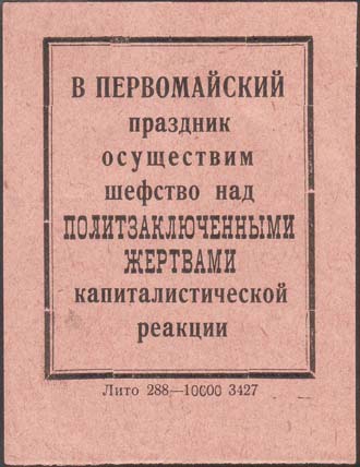 В центре текст в восемь строк: «В первомайский праздник осуществим шефство над политзаключенными жертвами капиталистической реакции».