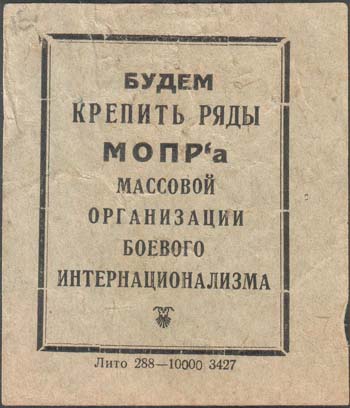 1930(?) г. Разм. 60 х 60 мм. Одноцветная печать на толстой желто-серой бумаге. В центре эмблема МОПР. По периметру текст: «МОПР. Не забывайте борцов. От членов МОПР красных печатников. Жертвуйте в фонд октябрьского подарка подшефным борцам».