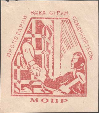 1930(?) г. Разм. 60 х 60 мм. Одноцветная печать на серо-коричневой бумаге. В центре в круглой рамке диаметром 45 мм аллегорический рисунок: рабочий выводит из тюрьмы узника в цепях. Сверху аббревиатура: «МОПР».