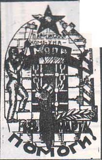 1930(?) г. 18 марта. Разм. 47 х 57 мм. Двухцветная печать на желтоватой бумаге. В центре в овальной рамке аллегорический рисунок: рабочий молотом сбивает кандалы с рук узника за решеткой. Сверху пятиконечная звезда и текст в две строки: «Парижская коммуна МОПР». Внизу текст в две строки: «18 марта Помоги!».