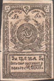 1930(?) г. Разм. Рамки 27 x 41 мм. Одноцветная печать на кремовой бумаге. В двойной прямоугольной декоративной рамке в центре стилизованное изображение герба СССР. В верхних углах аббревиатура: «МОПР». Ниже номинал и текст: «Пролетарии всех стран, соединяйтесь!». Внизу декоративной рамке текст в три строки: «5 к. цена 5 к. Весь сбор поступает в пользу МОПРа».