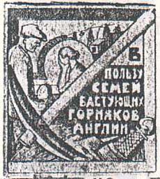 1930(?) г. Разм. 46 х 50 мм. Одноцветная печать на розово-серой бумаге. В прямоугольной рамке разм. 43 х 48 шахтер с семьей на фоне шахты, кирка и лампа. Справа текст в шесть строк: «В пользу семей бастующих горняков Англии».