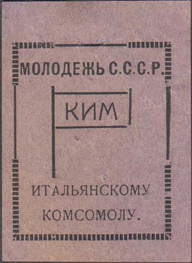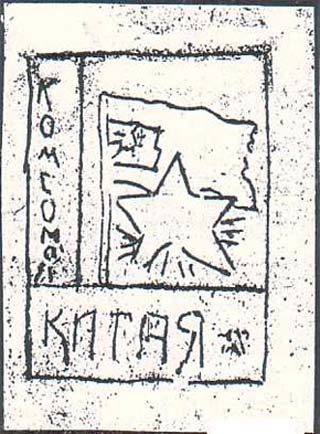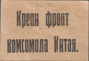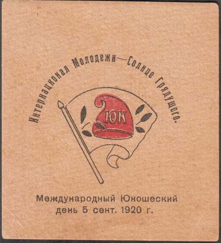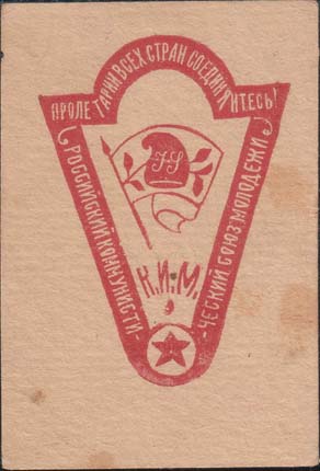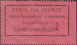 1930(?) г. Разм. 50 х 70 мм. Одноцветная печать низкого качества на гладкой светло-оранжевой бумаге. В центре комсомольский значок. Внизу текст в три строки: «ВЛКСМ в пользу МОПРа».