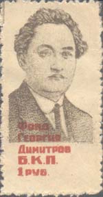 1930(?) г. Разм. по перфорации 25 х 48 мм. Двухцветная печать на кремовой бумаге. Нерегулярная зубц. В центре портрет Г. Димитрова. Ниже текст пять строк: «Фонд Георгия Димитров Б.К.П. 1 руб.».