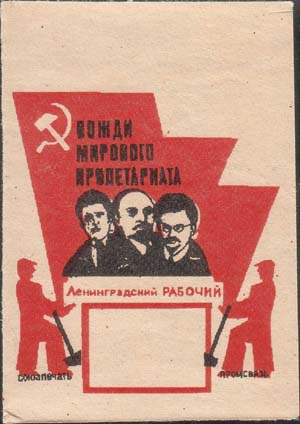 1930(?) г. Разм. 53 х 59 мм. Двухцветная печать на белой бумаге. В центре на фоне красных знамен портреты Л.Троцкого, Г.Зиновьева и Л.Каменева. На знамени сверху текст: «Вожди мирового пролетариата». Внизу текст: «Ленинградский рабочий». Внизу прямоугольная рамка, слева и справа рабочие с лопатами.