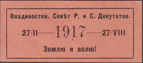 1917 г. 27.02.-27.03.1917 г. Разм. 80 х 35 мм. Одноцветная печать на тонкой розово-серой бумаге. В прямоугольной рамке разм. 71 х 28 мм в центре дата: «27/II – 1917 – 27/VII». Cверху текст: «Владивосток[ский]. Совет Р[абочих]. и С[олдатских]. Депутатов». Внизу текст: «Землю и Волю!».
