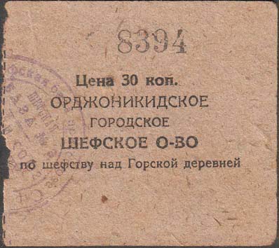 1932 г. Листок из квитанционной книжки разм. 66 х 58 мм. Одноцветная печать на серо-голубой бумаге низкого качества. Левосторонняя нерегулярная просечка. В центре текст в четыре строки: «Орджоникидское городское шефское о-во по шефству над Горской деревней». Сверху номер нумератором и номинал: «Цена 30 коп.». Слева вертикальная пунктирная разделительная линия. На лицевой стороне слева фрагмент фиолетового оттиска круглой контрольной печати диаметром 37 мм.