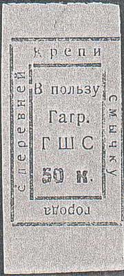 1932 г. Разм. 26 х 54 мм. Одноцветная печать на серой бумаге. В двойной прямоугольной рамке разм. 22,5 х 37,5 мм сверху текст в две строки: «В пользу Гагр[инского]. Г.Ш.С.». Внизу номинал. По периметру между рамками текст: «Крепи смычку города с деревней».