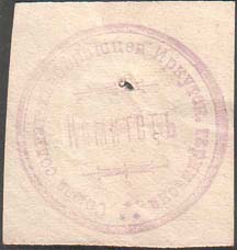 1918 г. Разм. 40 х 45 мм. Одноцветная печать на тонкой серой бумаге. На лицевой стороне фиолетовый оттиск круглой печати диаметром 35 мм. На печати текст: «Объединен[ый]. Совет Военных и Рабочих Депут[атов]. Иркутский Комитет».