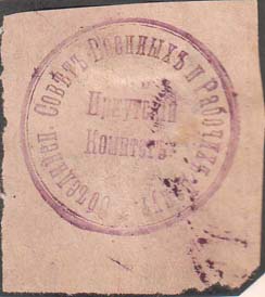 1917 г. Разм. 59 х 38 мм. Одноцветная печать на тонкой сероватой бумаге. В центре в прямоугольной рамке разм. 46 х 27 мм текст в три строки: «Жертвуйте на подготовку крестьян в Учредительное Собрание». Внизу текст: «Сов[ет]. Крест[ьянских]. Деп[утатов]. Киевск[ого]. Гарн[изона].».