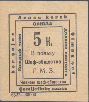 1932 г. 25.09.1932 г. Разм. 61 х 68 мм. Одноцветная печать на желтоватой бумаге. В центре в тройной прямо-угольной рамке разм. 47 х 54 мм текст в четыре строки: «5 к. в пользу Шеф-общества Г.М.З.». По периметру между рамками текст на русском и татарском (латинской шрифтом) языках: «Каждый член союза должен состоять Членом шеф-общества». Внизу под рамкой слева выходные данные: «6522-30000». На оборотной стороне фиолетовый оттиск круглой контрольной печати диаметром 43 мм с неразборчивым текстом.