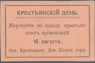 1917 г. 15.08.1917 г. Разм. 68 х 42 мм. Одноцветная печать на кирпично-красной бумаге. В прямоугольной рамке разм. 54 х 33 мм в центре текст в три строки: «Жертвуйте в пользу крестьянских организаций 15 августа». Сверху текст: «Крестьянский день». Внизу текст: «Сов[ет]. Крестьянск[их]. Деп[утатов]. Киевск[ого]. Гарн[изона].».