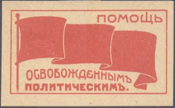 1917 г. Разм. 60 х 37 мм. Одноцветная печать на плотной желтоватой бумаге. В центре в прямоугольной рамке разм. 54 х 29 мм красный флаг со складками. В правом верхнем углу текст: «Помощь». Внизу продолжение текста в две строки: «Освобожденным политическим».