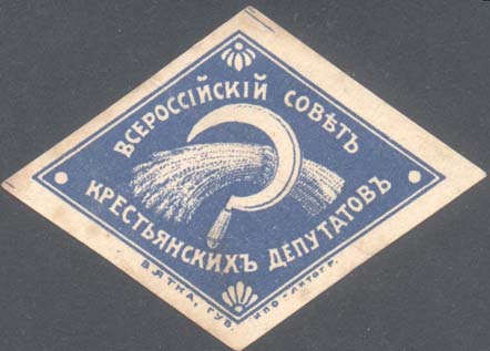 1917 г. 15.08.1917 г. Ромб разм. 74 х 53 мм. Одноцветная печать на плотной белой бумаге. В рамке в форме ромба разм. 63 х 45 мм на сплошном фоне серп и сноп пшеницы. Сверху полукругом текст: «Всероссийский совет». Внизу полукругом продолжение текста: «Крестьянских депутатов». По внутренним углам рамки декоративные элементы. Внизу по наружному периметру рамки выходные данные мелким шрифтом: «Вятка, Губ. Типо-литогр.».