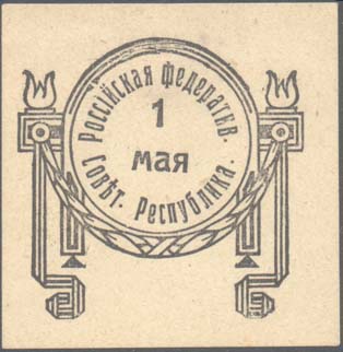 1920(?) г. Разм. 52 х 54 мм. Одноцветная печать на плотной белой бумаге. В центре в круглой рамке со сложным геометрическим орнаментом текст в две строки: «1 мая». По внутреннему периметру рамки текст: «Российская Федератив[ная]. Совет[ская]. Республика».