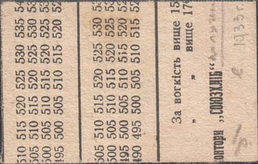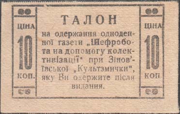 1932 г. Разм. 62 х 39 мм. Одноцветная печать на толстой кремовой бумаге. Мелкая нерегулярная просечка. В прямоугольной рамке разм. 53 х 32 мм в центре текст в восемь строк на украинском языке: «Талон на приобретение однодневной газеты «Шефработа на помощь коллективизации» при Зиновьевской «Культсмычке», которую Вы получите после выпуска». Слева и справа в отдельных рамках номинал.