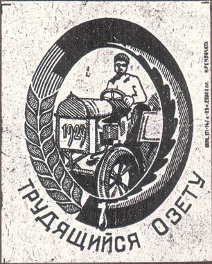 1929 г. Разм. 51 х 63 мм. Одноцветная печать на желтоватой бумаге. В двойной овальной рамке разм. 41 х 51 мм из серпа и колоса тракторист на тракторе с датой на радиаторе «1929». Внизу под рамкой полукругом текст: «Трудящийся Озету». Справа вертикально выходные данные мелким шрифтом: «Окрл. 171-76/ а-29 г. 20000 экз. Кремпепчать».