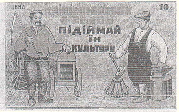 1922(?) г. Разм. 52 х 69 мм. Двухцветная печать на бежевой бумаге. В двойной прямоугольной рамке разм. 47 х 63 мм пахарь на фоне деревни. Сверху лента с текстом: «Сейте сознание в дерев[не].». По периметру между рамками текст: «Сбор на пропаганду среди крестьян основного политическ[ого]. строя».