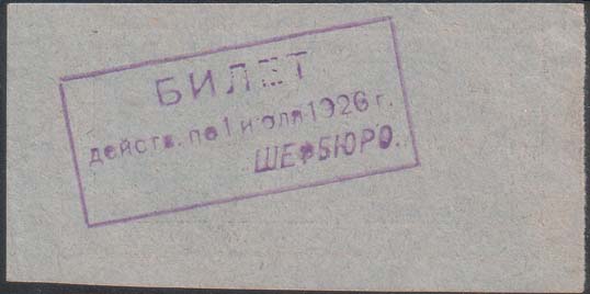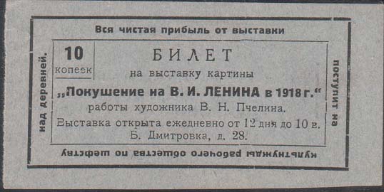 1926 г. Разм. 89 х 44 мм. Одноцветная печать на серо-синей бумаге. В двойной прямоугольной рамке разм. 76 х 35 мм текст в шесть строк: «Билет на выставку картин «Покушение на В.И.Ленина в 1918 г.» работы художника В.Н.Пчелина. Выставка открыта ежедневно от 12 дня до 10 в[ечера]. Б[ольшая]. Дмитровка, д[ом]. 28». В левом верхнем углу номинал в прямоугольной рамке. По периметру между рамками текст: «Вся чистая прибыль от выставки поступит на культнужды рабочего общества по шефству над деревней». На оборотной стороне фиолетовый оттиск прямоугольного штампа разм. 53 х 24 мм с текстом в три строки: «Билет действ[ителен]. По 1 июля 1926 г. Шефбюро».