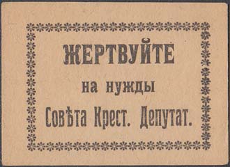 1917(?) г. Разм. 56 х 40 мм. Одноцветная двухсторонняя печать на желтоватой бумаге. На лицевой и оборотной стороне в центре в прямоугольных декоративных рамках разм. 45 х 31,5 мм текст в три строки: «Жертвуйте на нужды Совета Крест[ьянских]. Депутат[ов].».