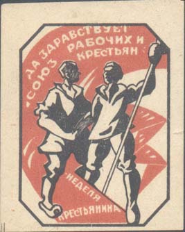 1919(?) г. Разм. 45 х 55 мм. Двухцветная печать на белой бумаге. В центре в восьмиугольной рамке разм. 36 х 49 мм рабочий со знаменем и крестьянин. На знамени текст в пять строк: «Да здравствует союз рабочих и крестьян. Неделя крестьянина».