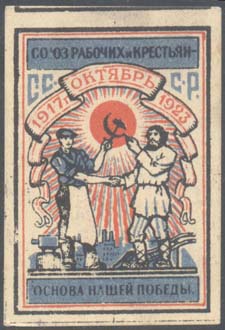 1923 г. Разм. рамки 33 х 48 мм. Трехцветная печать на кремовой бумаге. В центре в двойной прямо-угольной рамке рабочий и крестьянин держат серп и молот на фоне восходящего солнца с лучами. Внизу наковальня и плуг, на заднем плане завод. Сверху на ленте текст: «1917 г. Октябрь 1923». Сверху текст в две строки: «Союз рабочих и крестьян». Внизу продолжение текста: «Основа нашей победы».