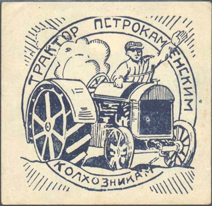 1928(?) г. Разм. 72 х 69 мм. Одноцветная печать на белой бумаге. В двойной круглой рамке диаметром 61 мм в центре тракторист на тракторе. По периметру между рамками текст: «Трактор Петрокаменским колхозникам».