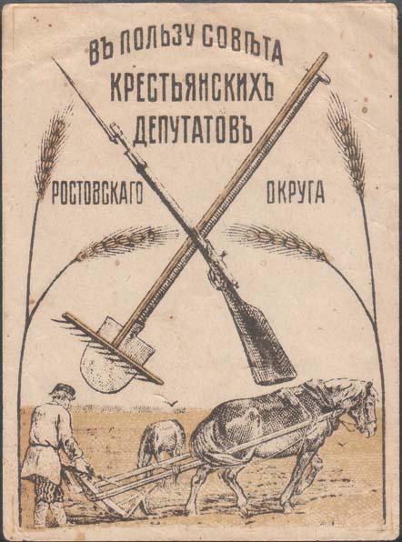 1919(?) г. Разм. 73 х 101 мм. Двухцветная печать на кремовой бумаге. В центре скрещенные лопата, грабли и винтовка в обрамлении колосьев. Сверху текст в четыре строки: «В пользу Совета Крестьянских депутатов Ростовского округа». Внизу пахарь в поле.