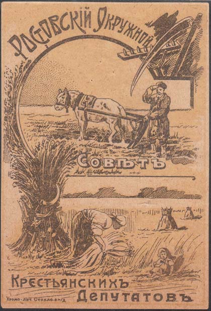 1919(?) г. Разм. 70 х 103 мм. Двухцветная печать на толстой светло-коричневой бумаге. Сверху пахарь в поле, коса и грабли. Внизу сноп, серп и женщина с ребенком, работающая в поле. Сверху полукругом текст: «Ростовский Окружной». В центре продолжение текста: «Совет». Внизу продолжение текста в две строки: «Крестьянских Депутатов». Слева внизу выходные данные мелким шрифтом: «Хромо-лит. Скобло Р. н/Д».