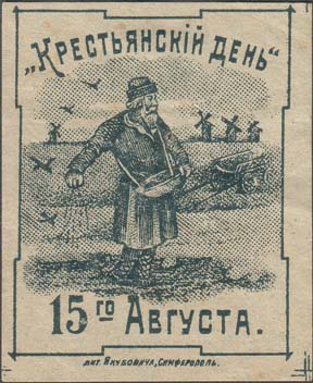 1917 г. 15.08.1917 г. Разм. 48 х 59 мм. Одноцветная печать на бумаге различных цветов. В центре в прямоугольной рамке разм. 42,5 х 53,5 мм с декоративными уступами крестьянин с лукошком, сеющий зерно. На заднем фоне ветряные мельницы. Сверху полукругом текст: ««Крестьянский день»». Внизу дата: «15-го Августа». Внизу под рамкой выходные данные мелким шрифтом: «Лит. Якубовича, Симферополь».