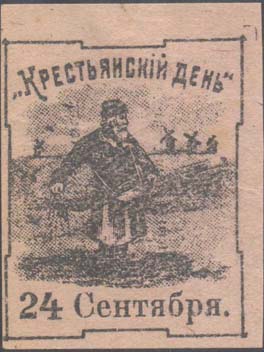 1918(?) г. 24 сентября Разм. 44 х 58 мм. Одноцветная печать на розово-серой бумаге. В центре в прямоугольной рамке разм. 40 х 50 мм с декоративными уступами крестьянин с лукошком, сеющий зерно. На заднем фоне ветряные мельницы. Сверху полукругом текст: ««Крестьянский день»». Внизу дата «24 сентября».