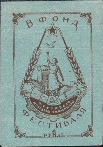 1957 г. Разм. 52 x 73 мм. Двухцветная печать на белой бумаге. В прямоугольной декоративной рамке разм. 40 х 63 мм в центре значок фестиваля молодежи Смоленщины. Сверху полукругом текст: «В фонд». Внизу продолжение текста полукругом: «Фестиваля» и номинал.
