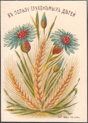 1915 г. Разм. 48 х 68 мм. Многоцветная печать на тол-стой белой бумаге. В центре полевые цветы. Сверху полукругом текст: «В пользу глухонемых детей». В правом нижнем углу мелким шрифтом выходные данные: «Лит. Южн. Тов. Симф.».